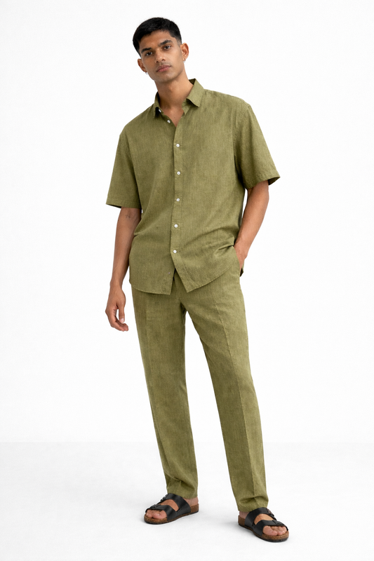 Olive Green Linen Set – Half Sleeves Shirt & Pants