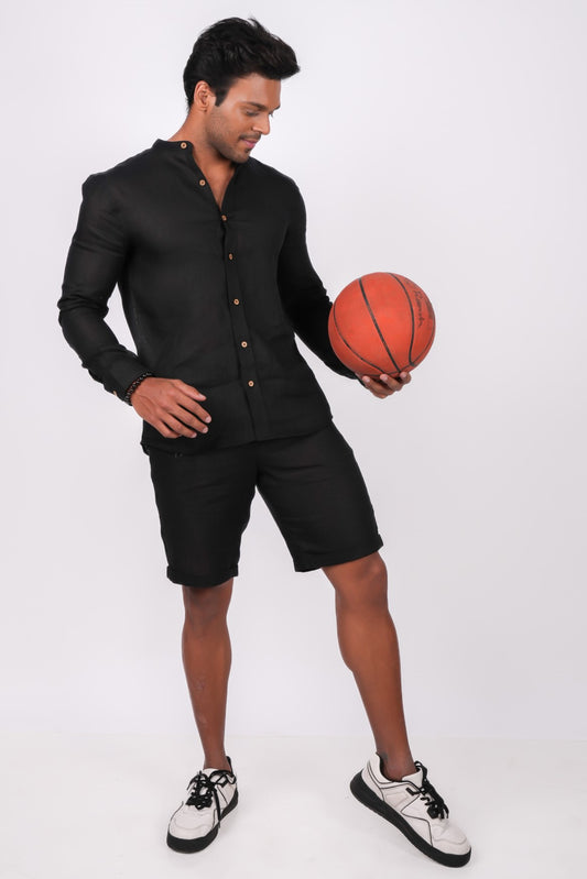 Midnight Black Co-ord Set- Includes Pair of Shorts and Chinese Collar shirt