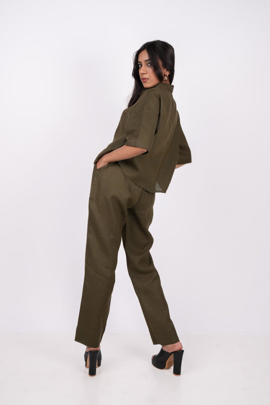Forest Green Linen Co-Ord Set - Includes Pair of Pants and Half Sleeves Drooping Shoulder Shirt