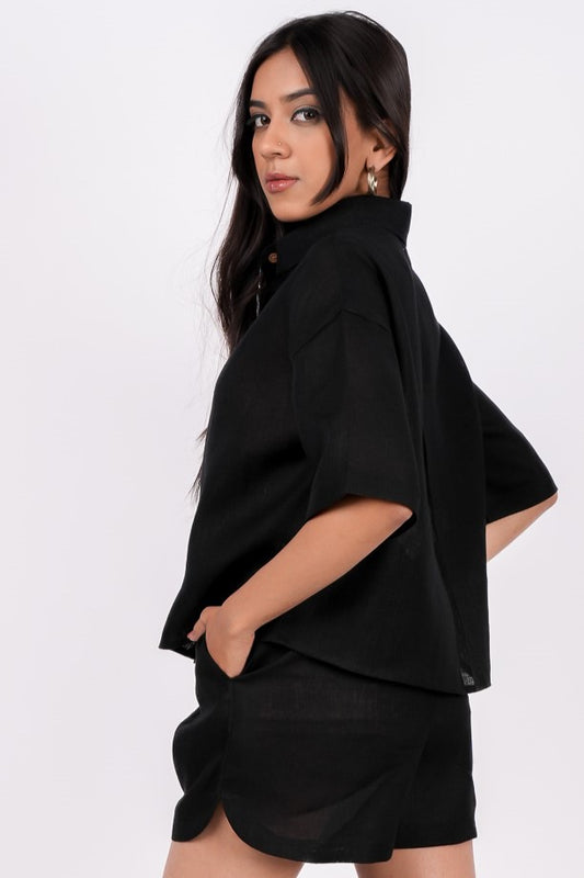 Midnight Black Linen Co-Ord Set - Includes Pair of Shorts and Half Sleeves Drooping Shoulder Shirt