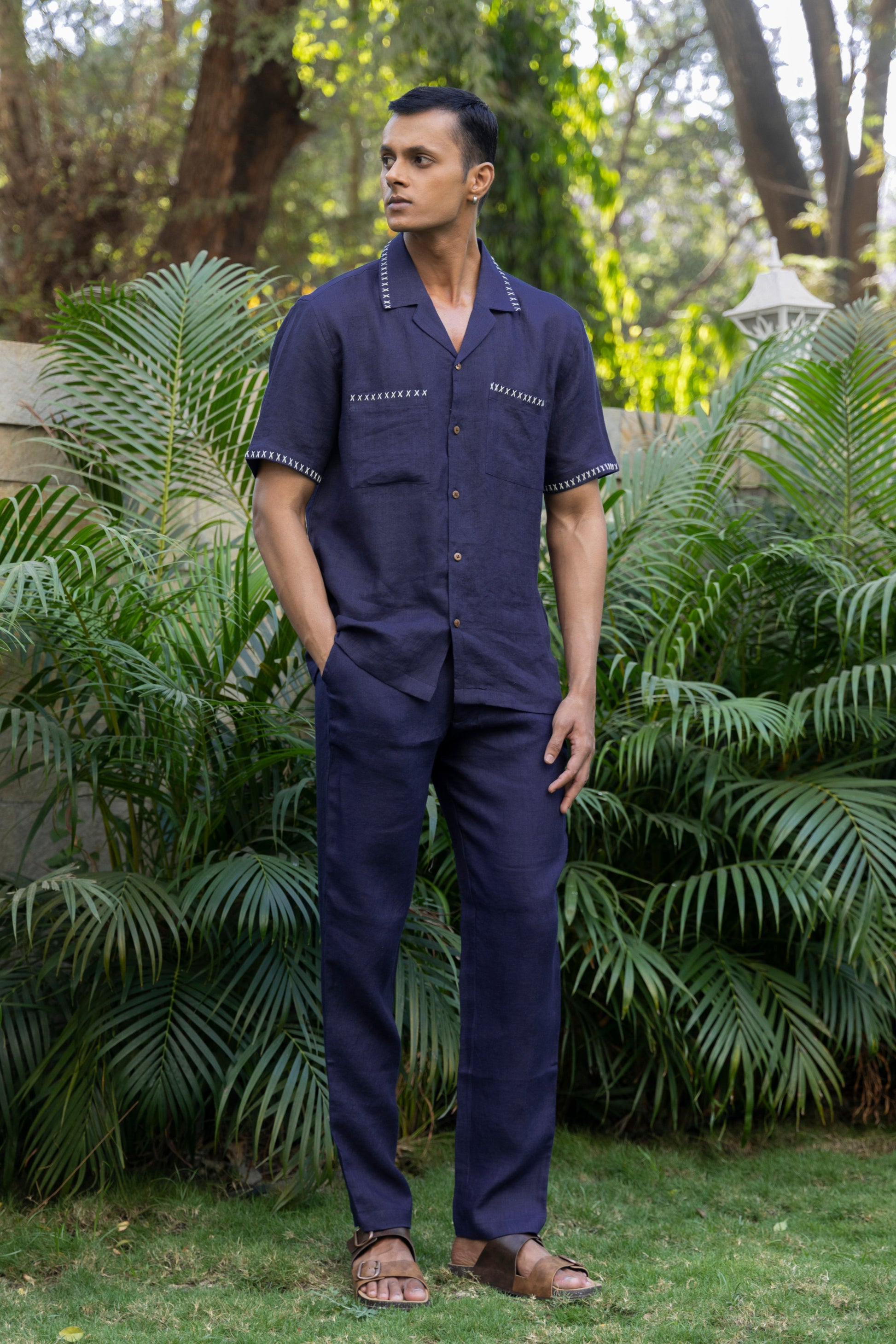 Meet Criss Cross, the shirt that knows how to make a mark—literally! Crafted from pure linen, this navy blue Cuban collar shirt is breezy, bold, and effortlessly stylish. The real showstopper? Hand-embroidered cross stitches lining the collar, sleeves, and pockets, adding a touch of artisanal charm to your wardrobe.