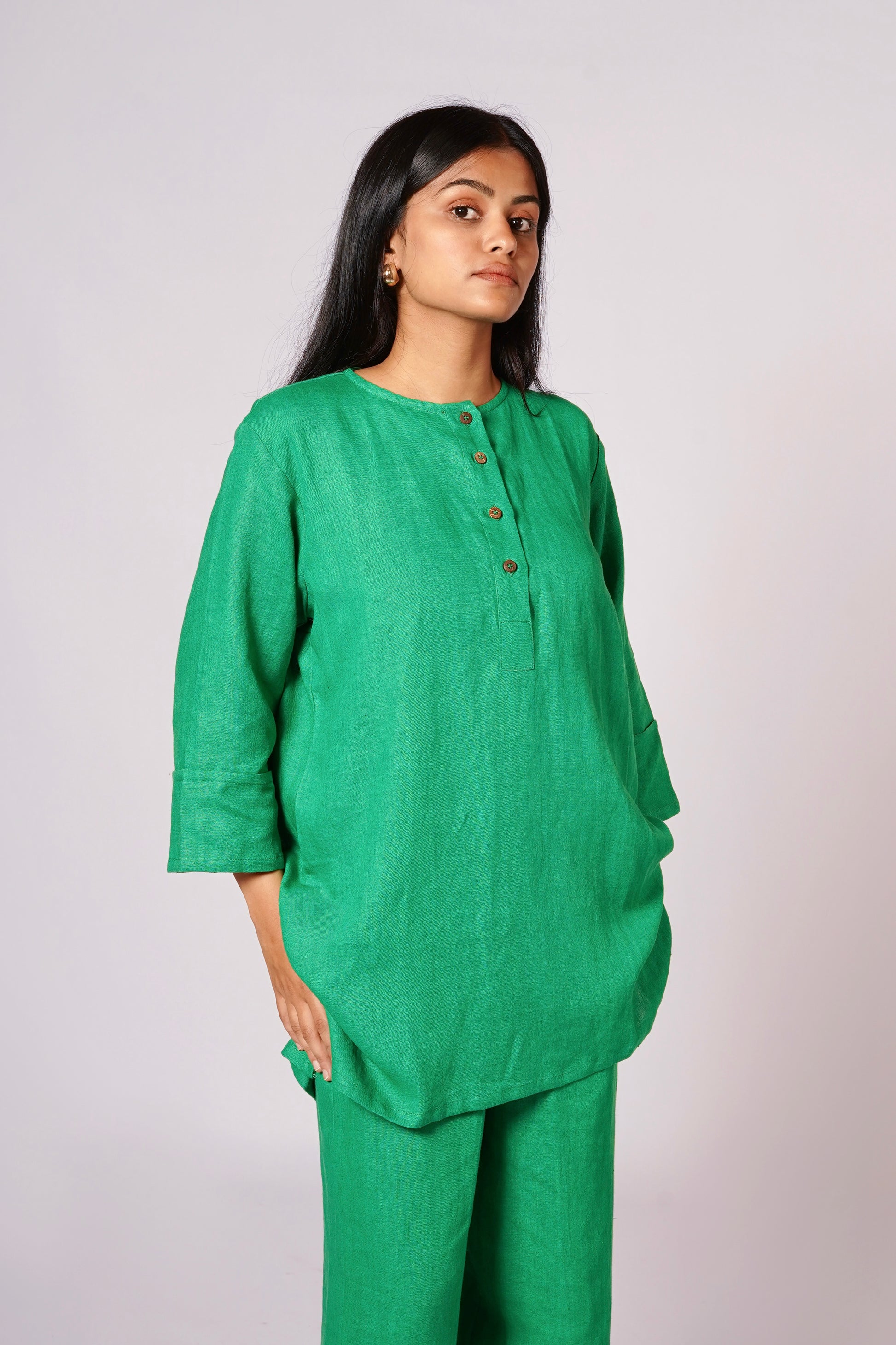 This vibrant and comfortable two-piece set is crafted from 100% pure, breathable linen in a stunning, saturated Vibrant Green colour.