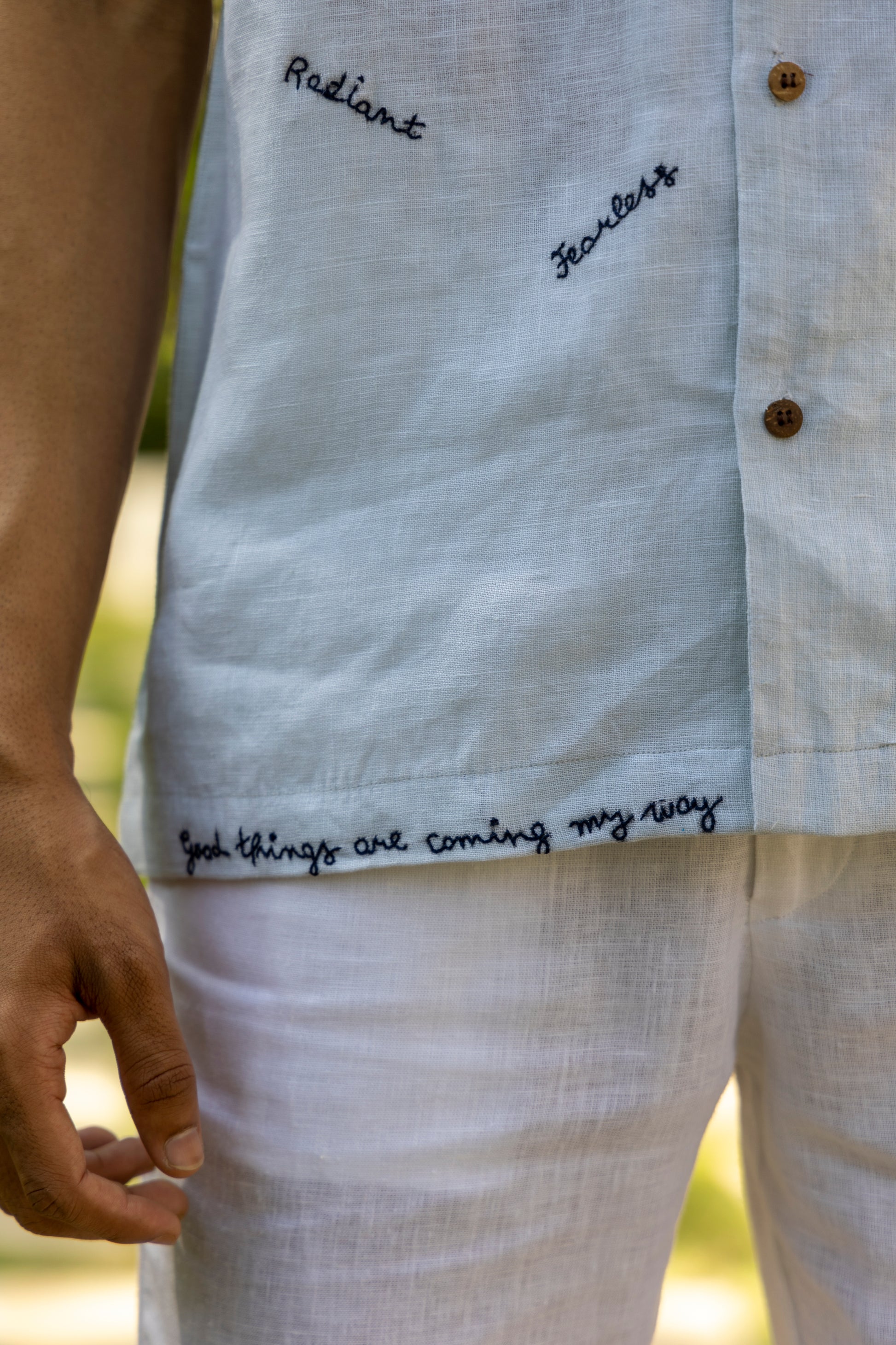 Own your power with the I AM hand-embroidered linen shirt. Crafted from pure linen in a rich blue hue, this Cuban-collared stunner is more than just a shirt—it's a walking affirmation board. Scattered with positive affirmations and bold embroidered quotes like "Good things are coming my way" and "Dream >> Believe >> Achieve", this piece is a daily reminder of confidence, ambition, and self-belief.