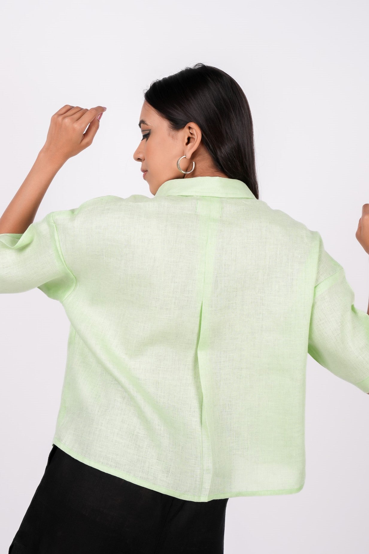Bring a burst of refreshing energy to your wardrobe with our Kiwi Green Linen Drooping Shoulder Shirt. The boxy profile, drop shoulders, and three-quarter sleeves create a chic and relaxed look perfect for vacations or day wear. The pure linen material and wooden buttons add a touch of luxury to the piece. Pair it with white shorts or pants for a resort-inspired look that is both classy and rejuvenating.