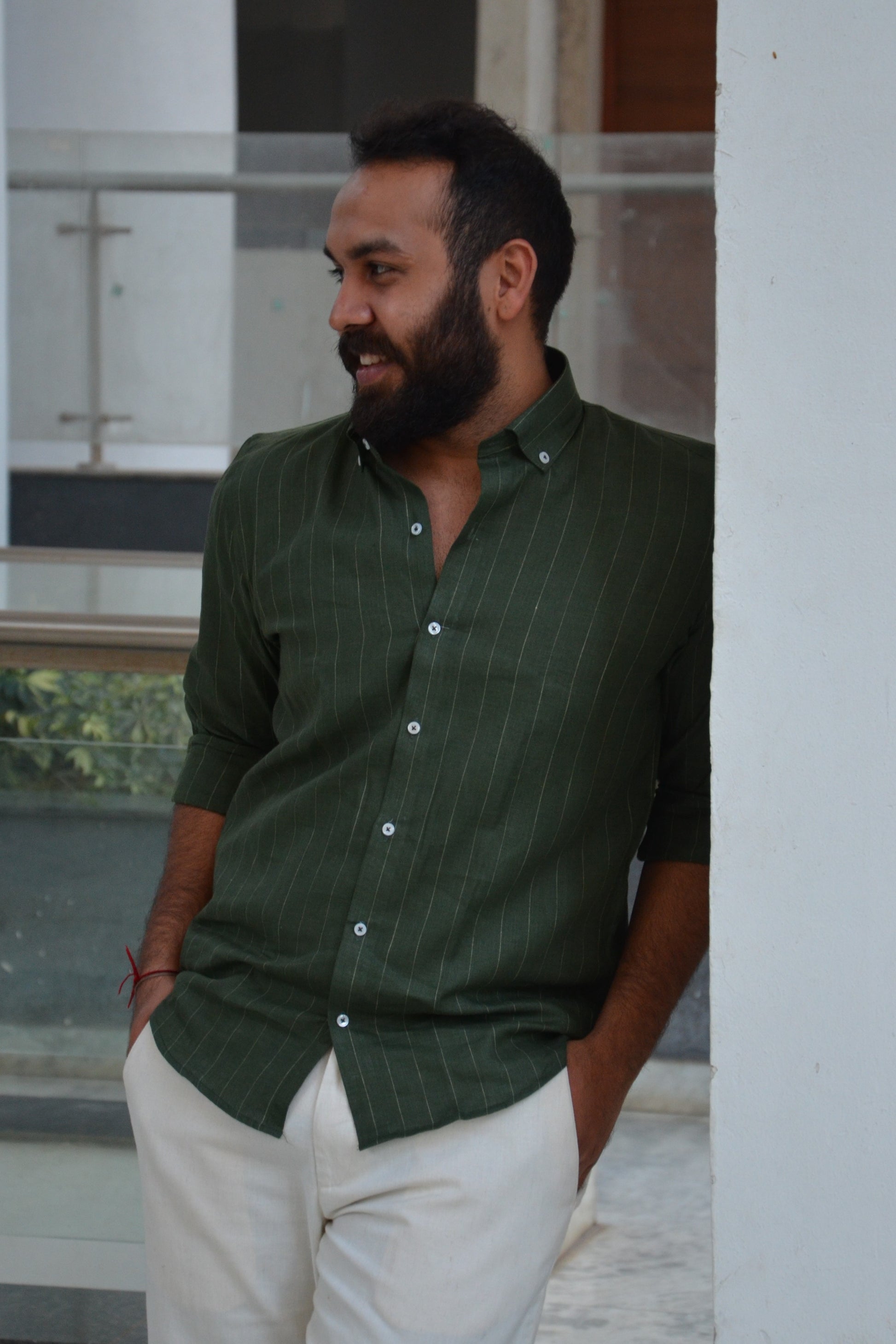 Mariner's Charm - Dark Green Striped Linen Shirt
