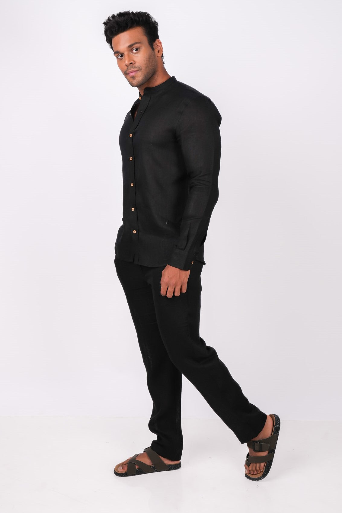 Elevate your style with our Midnight Black Co-ord Set. Crafted from premium 100% pure linen, this lightweight set features a pair of pants and a Chinese collar shirt with wooden buttons. Perfect for any occasion, from a relaxed day out to a dinner party. Pair with shoes or sandals for a sleek and sophisticated look.