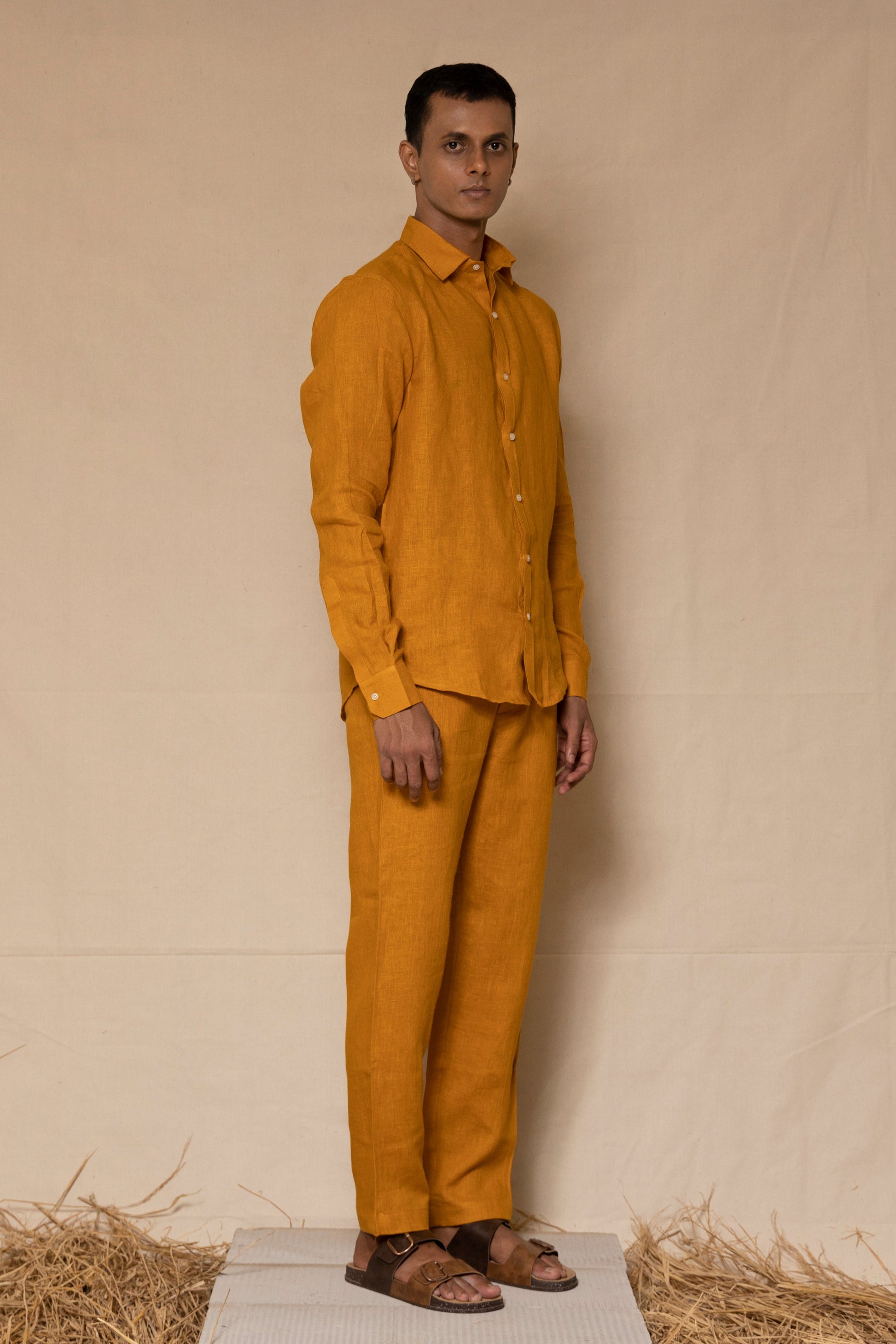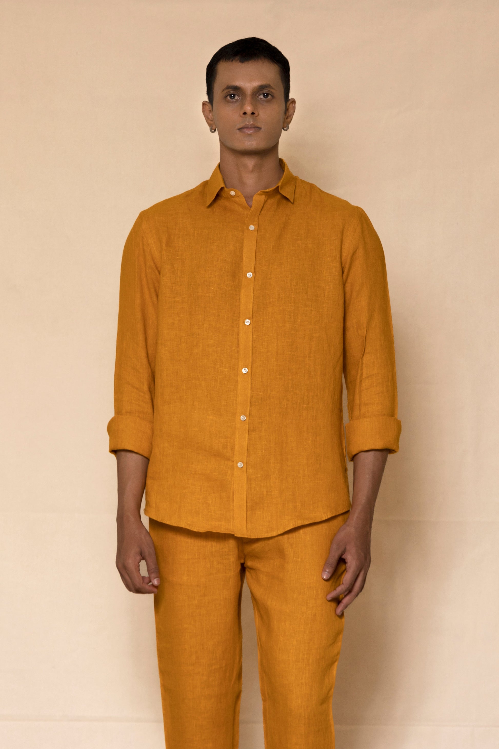 A timeless co-ord set in warm mustard, crafted from pure linen for a balance of structure and ease. The regular-collar shirt and tailored pants create a clean, modern silhouette. Lightweight, breathable, and designed for all-day comfort.