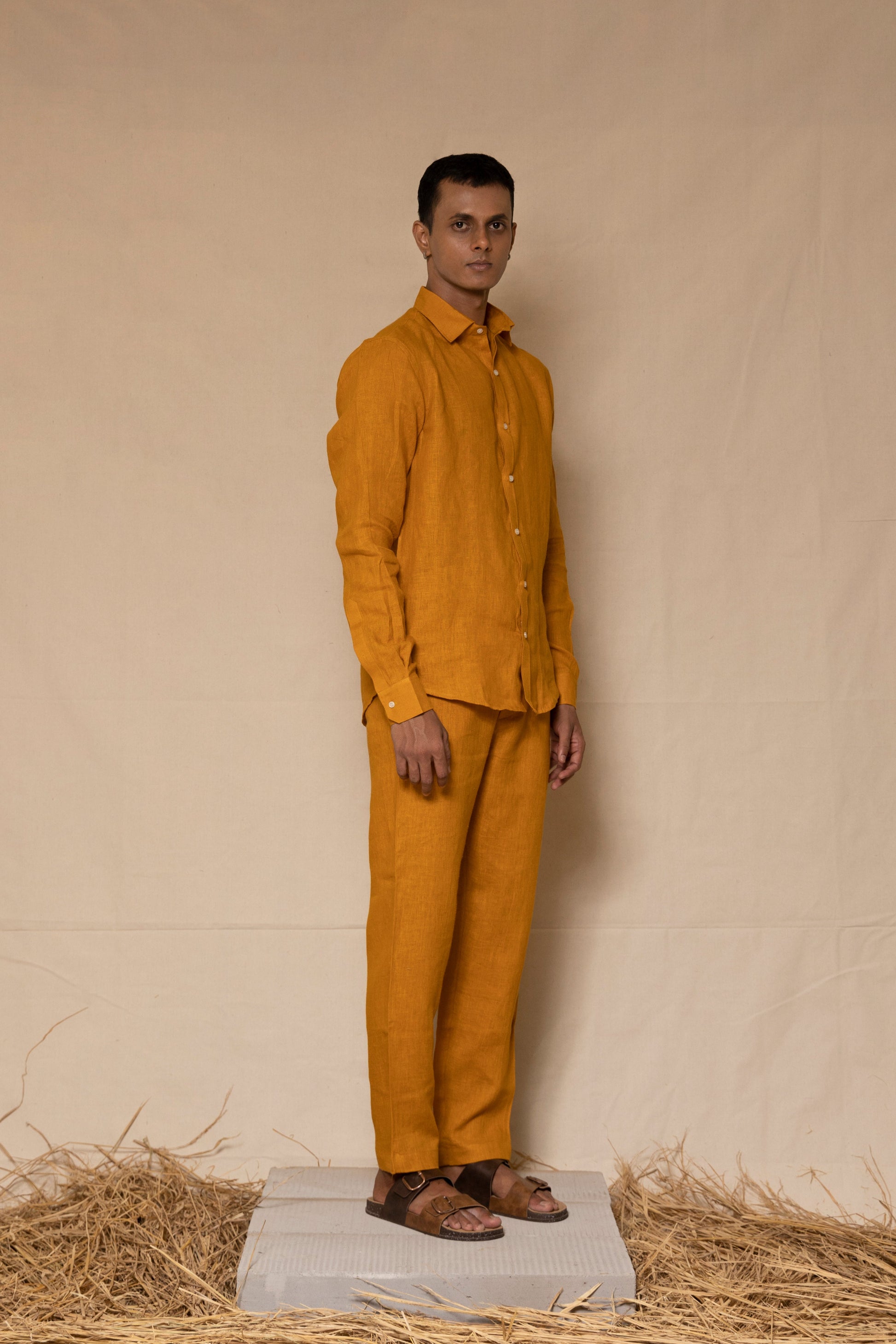 A statement in effortless elegance, this mustard linen shirt is tailored with a regular collar and a clean, structured finish. The breathable linen fabric offers a light, airy feel, while the rich hue adds depth and character. Designed for versatility, it refines any look with understated sophistication.