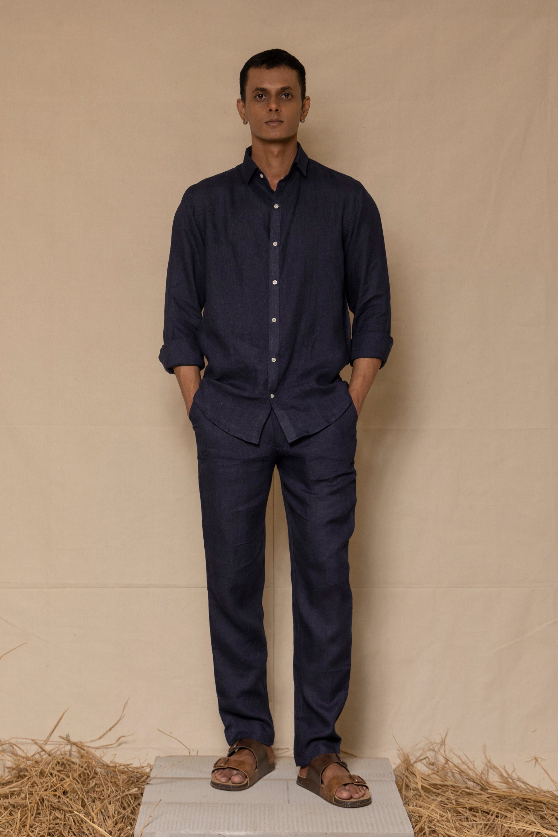 A classic co-ord set in deep navy blue, crafted from lightweight linen for a balanced blend of comfort and structure. The regular-collar shirt pairs with tailored pants, creating a clean, versatile look. Designed with attention to detail and finished with a smooth, natural texture.