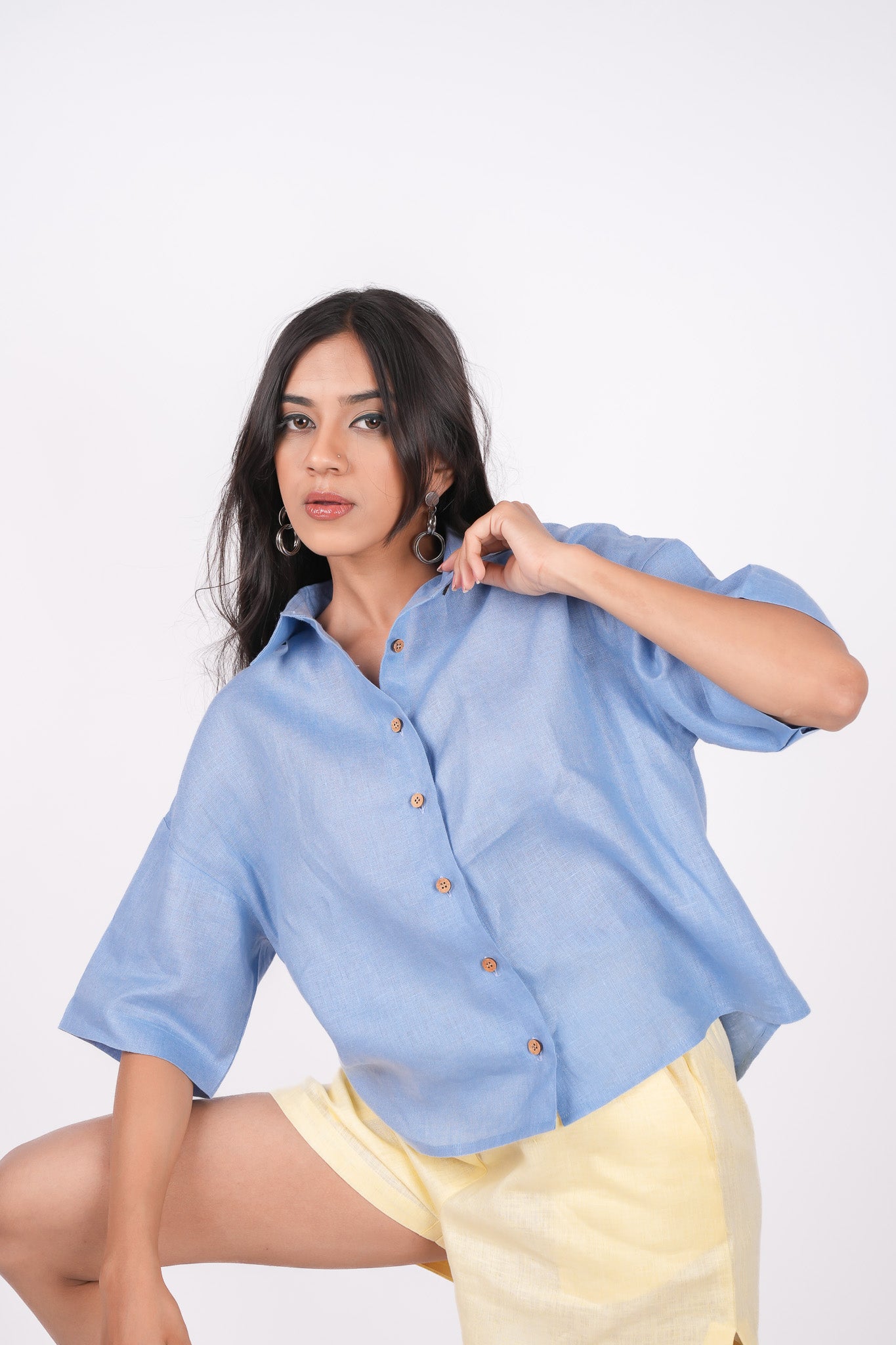 Make a splash with our Ocean Blue Linen Drooping Shoulder Shirt! The boxy profile and drop shoulders lend a relaxed, effortless vibe, while the spread collars and three-quarter sleeves add sophistication. Perfect for vacation or day wear, pair it with white shorts or pants for a resort-worthy look. Crafted from 100% pure linen with wooden buttons, this shirt is as sustainable as it is stylish.