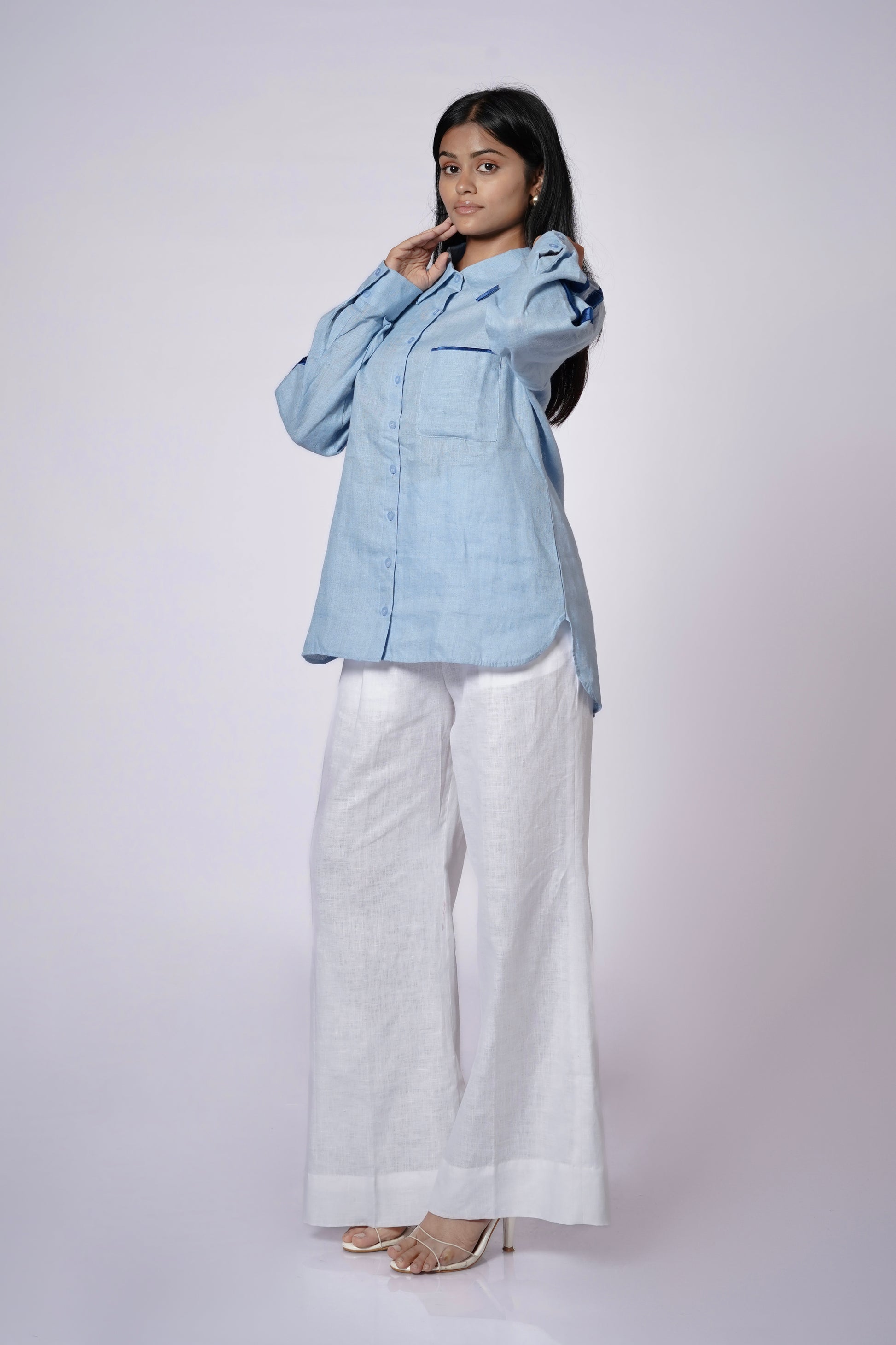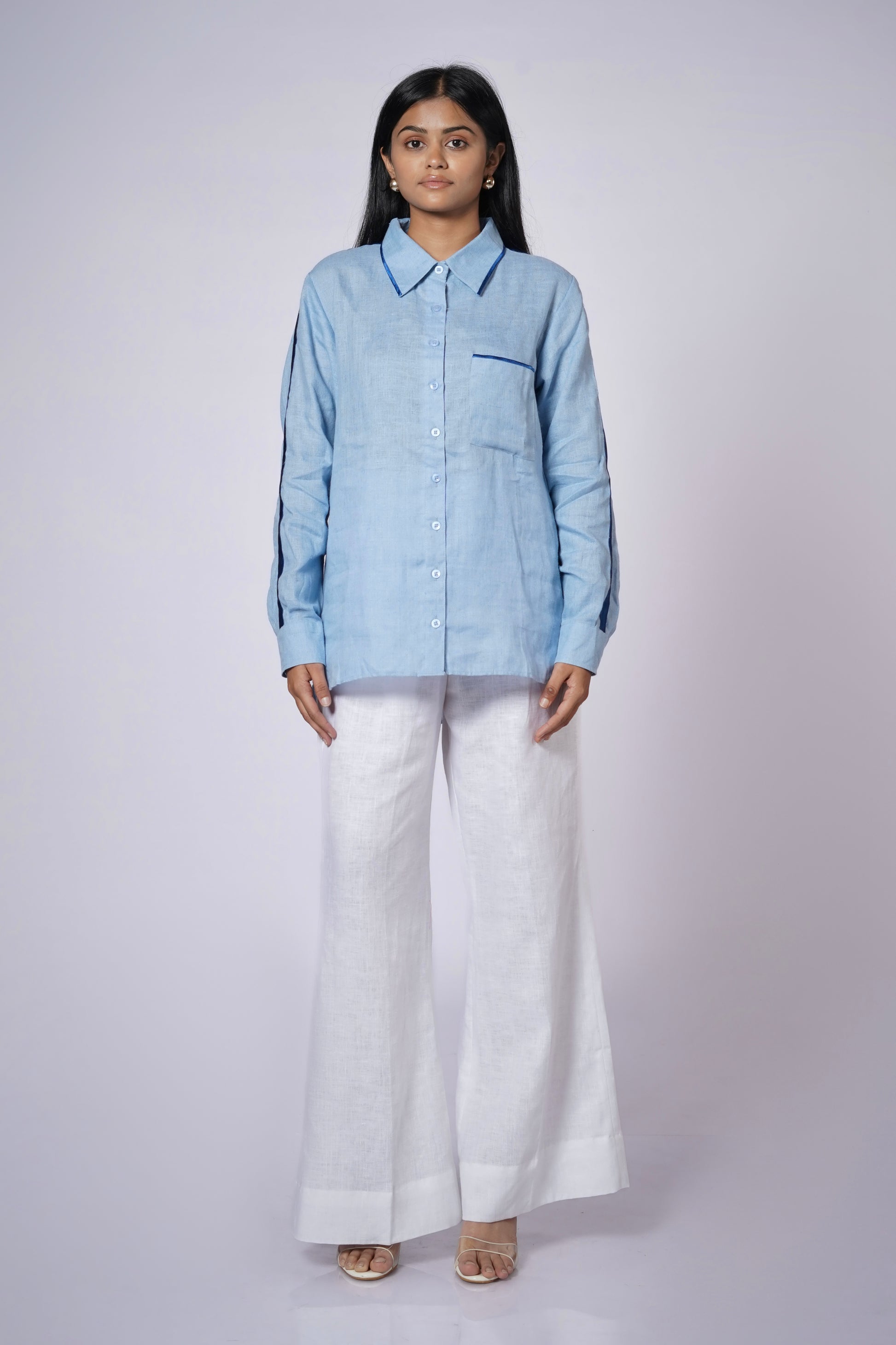 OCEAN BLUE LINEN SHIRT WITH SATIN DETAILING