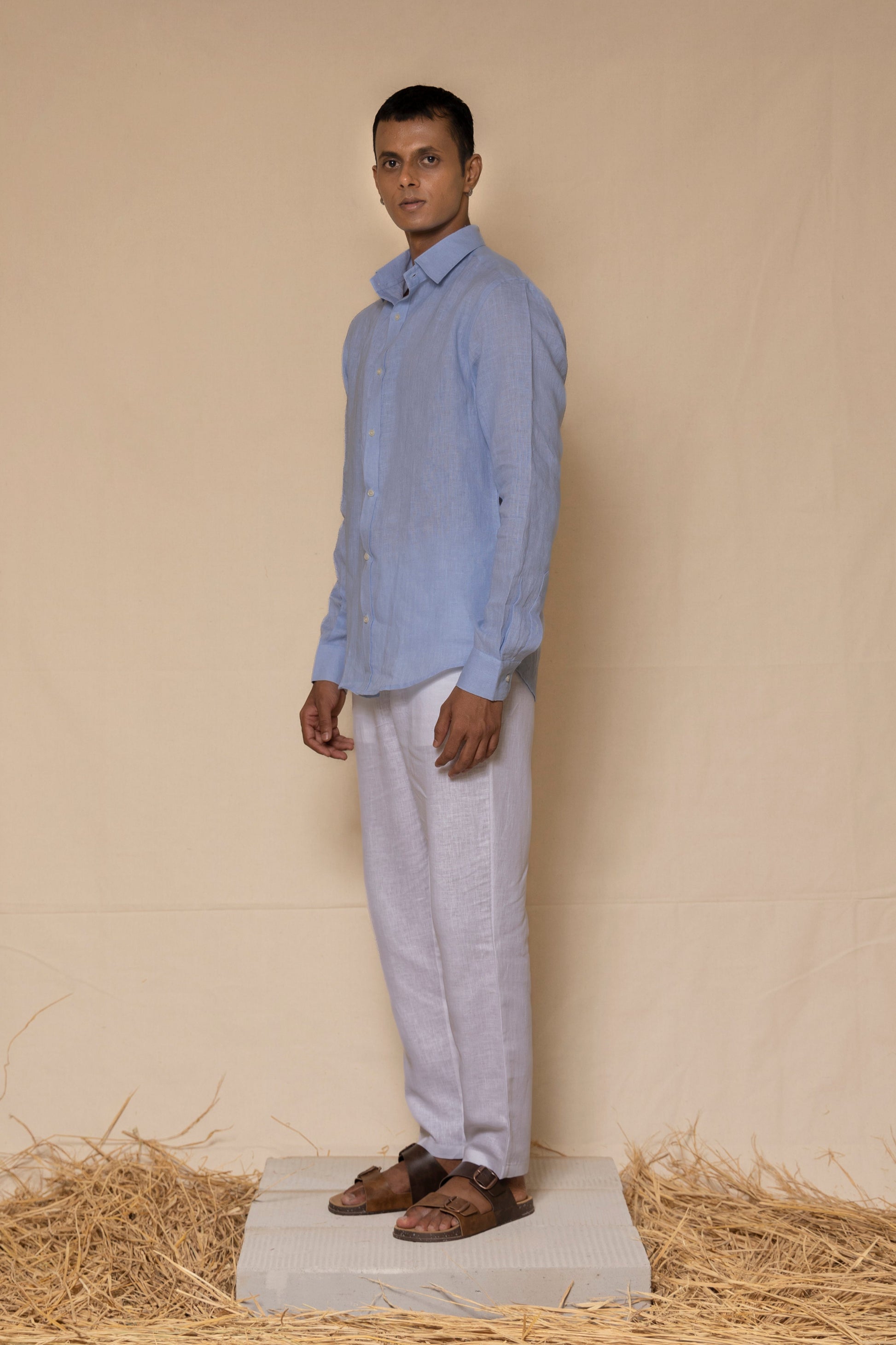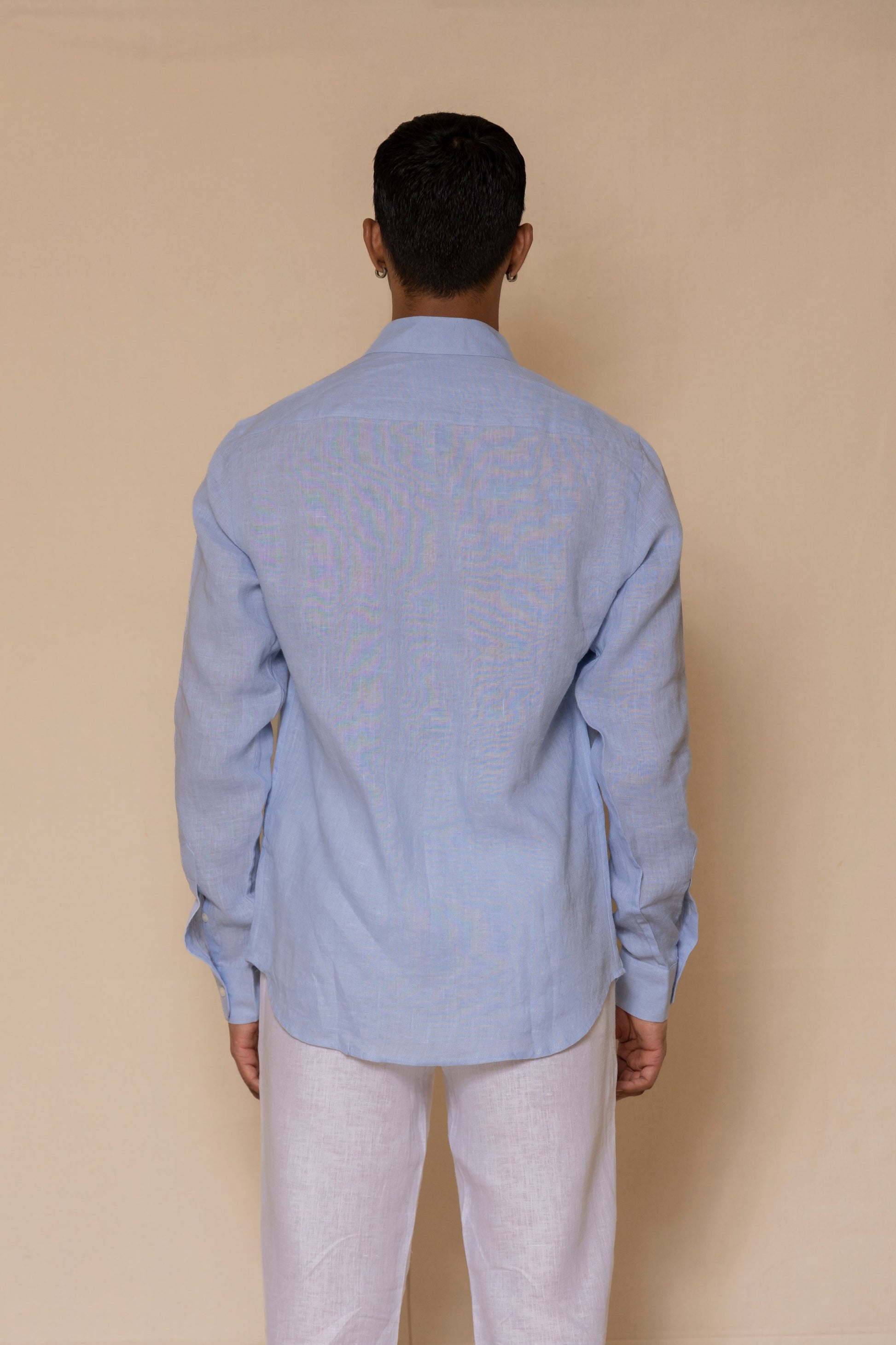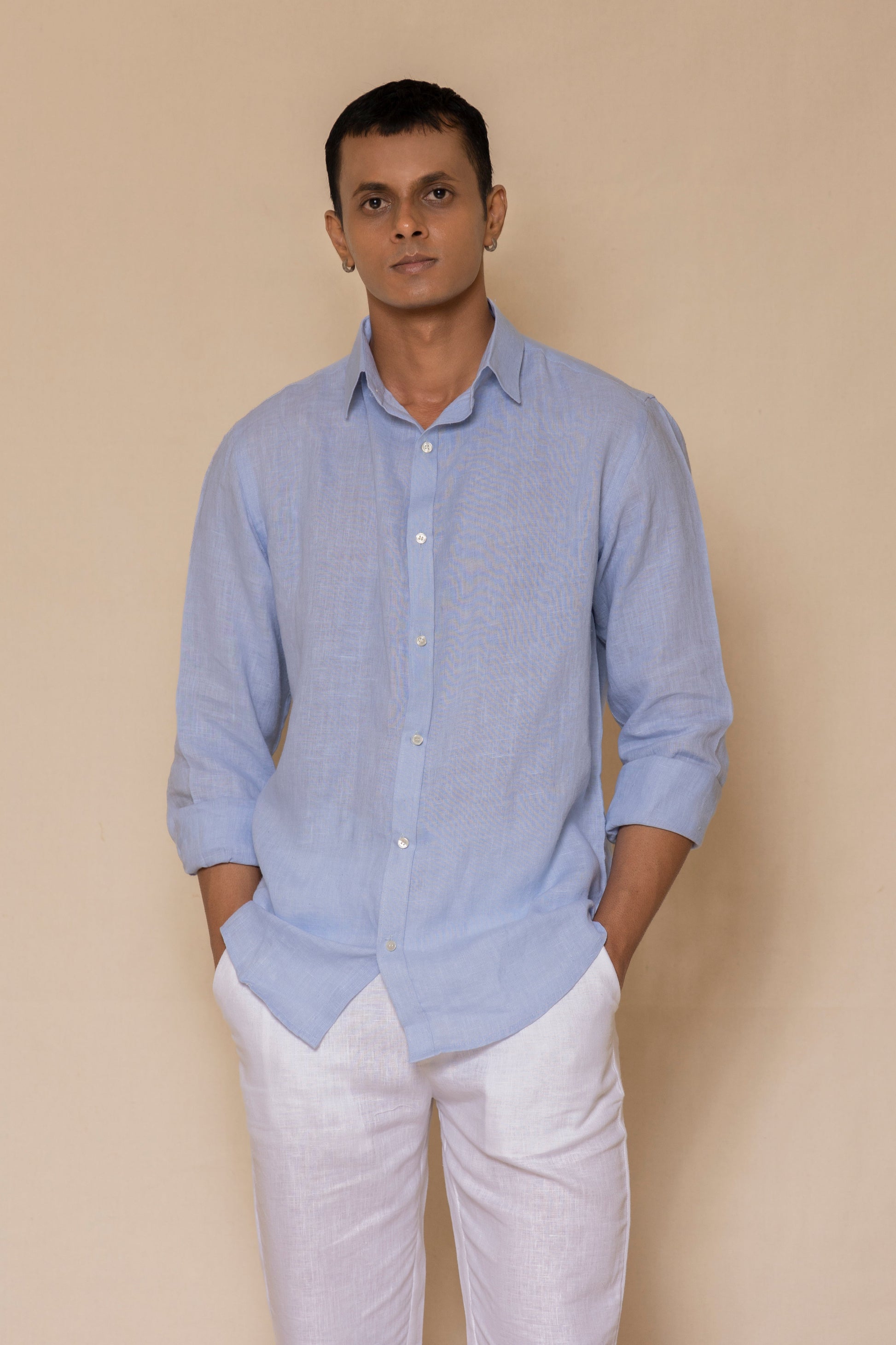 A classic sky blue linen shirt, crafted for comfort and ease. Made from breathable, lightweight linen, it features a regular collar and a relaxed silhouette. The soft texture and natural drape enhance its timeless appeal, making it a versatile choice for any occasion.
