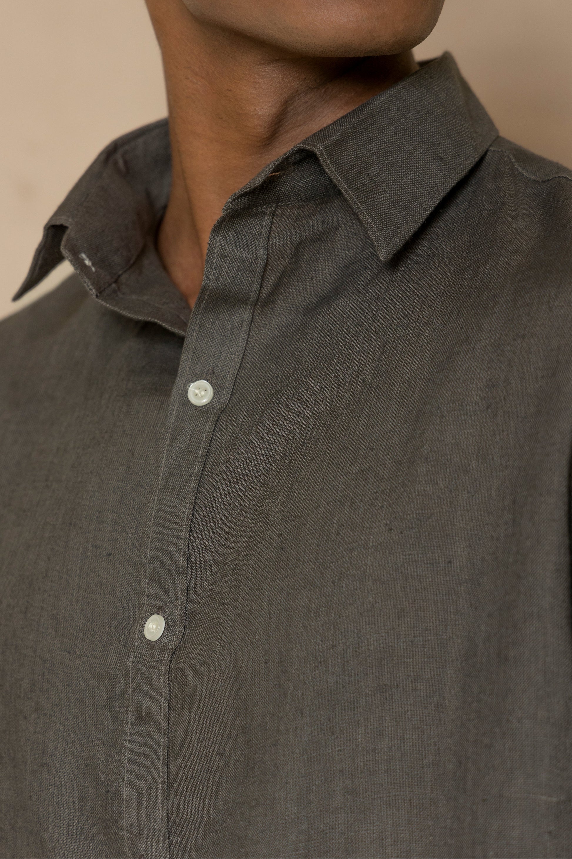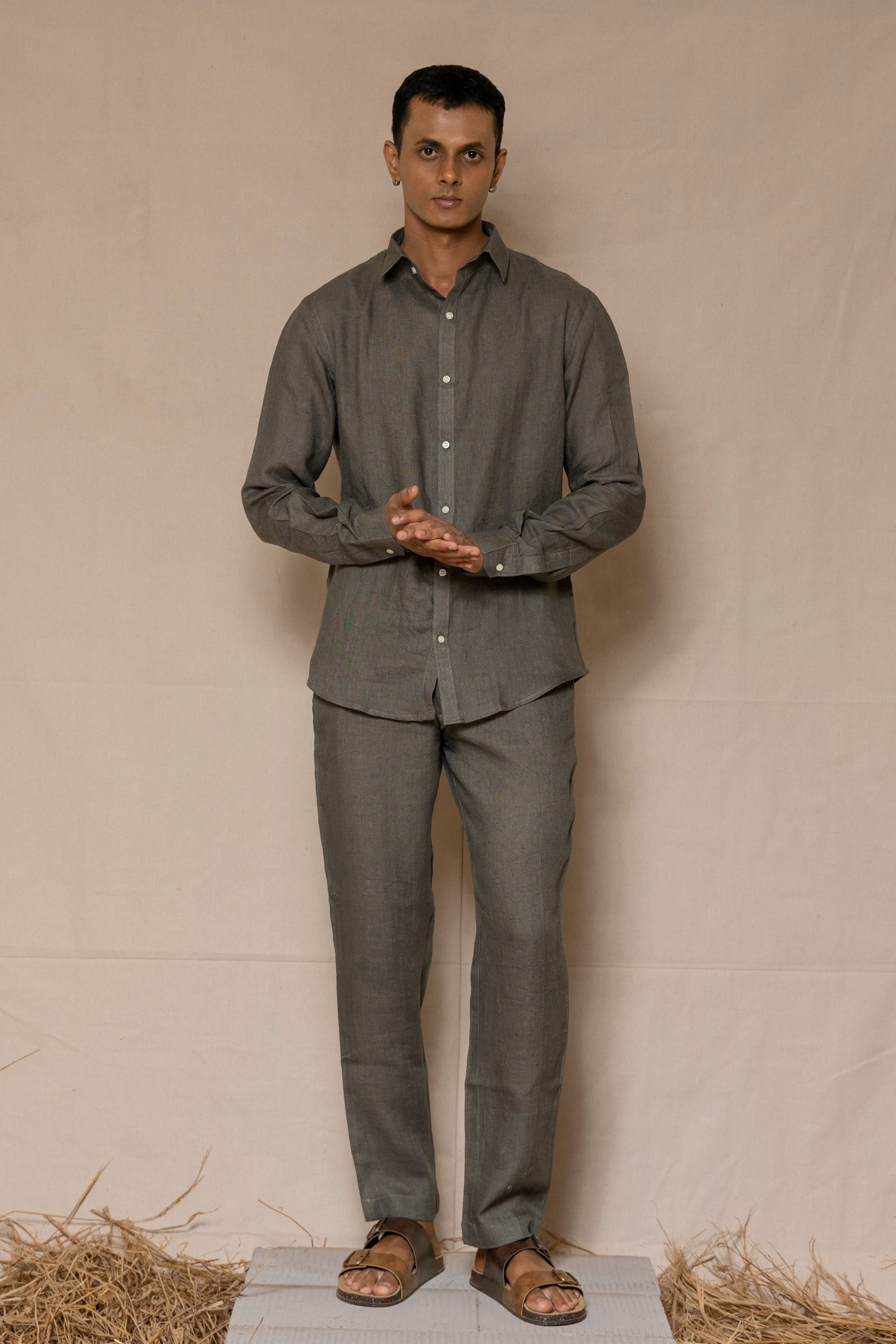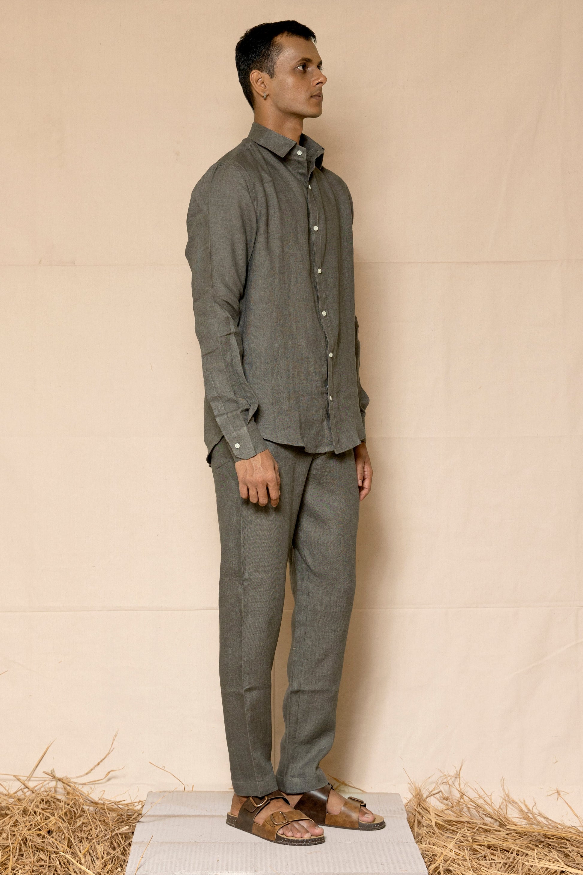 A tailored co-ord set in a deep steel grey, crafted from lightweight linen for a structured yet relaxed silhouette. The regular-collar shirt and tailored pants create a seamless look with clean lines and a modern aesthetic. Soft, breathable, and designed for all-day comfort.