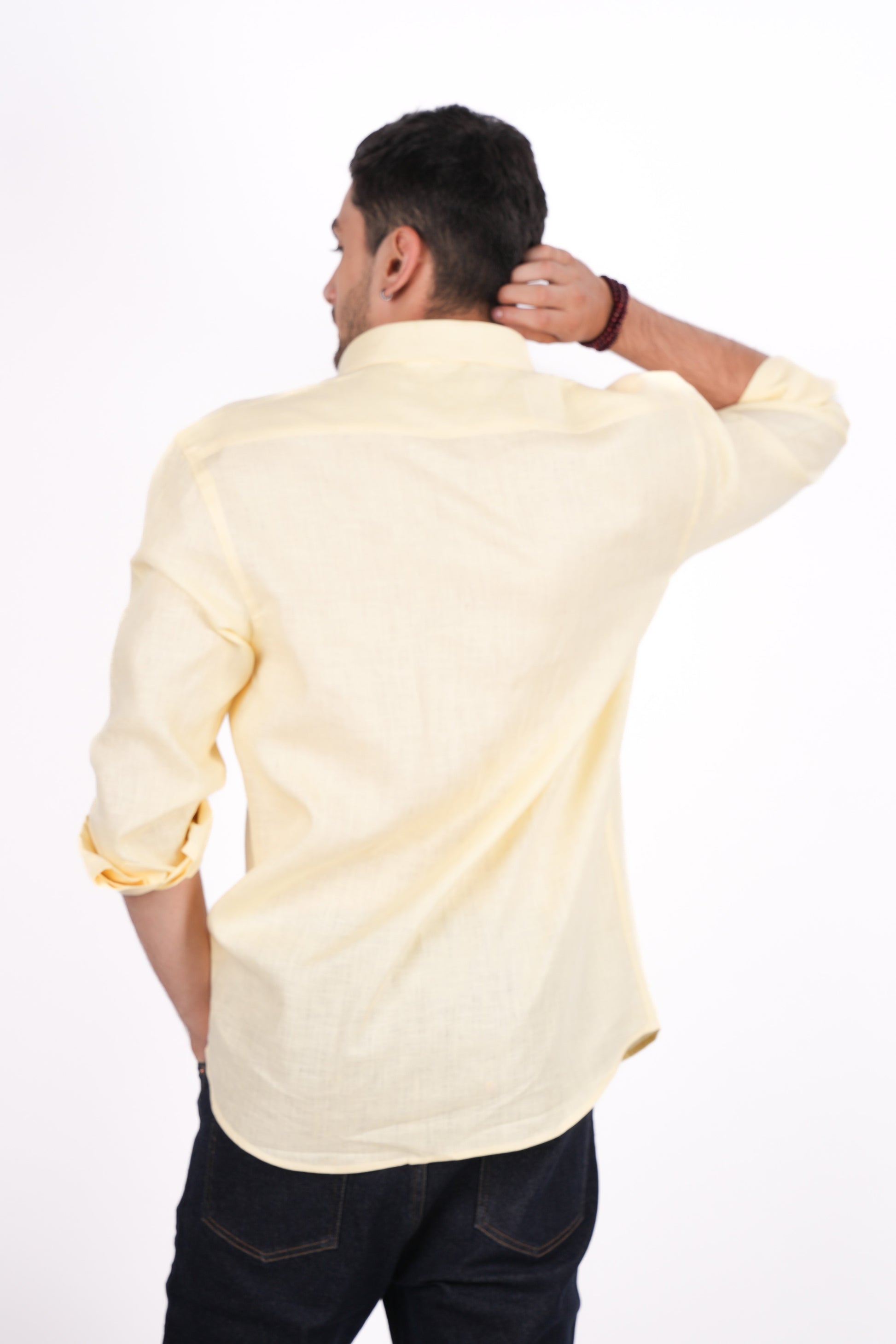Elevate your summer wardrobe with our Sunshine Yellow Regular Collar Shirt. Perfect for any beach or pool party, this shirt features wooden buttons and a buttoned cuff for a stylish touch. Wear it with white trousers, jeans or shorts to complete the look. Made from 100% pure linen, this shirt offers a lightweight and breathable option for your summer wardrobe. The vibrant and fresh