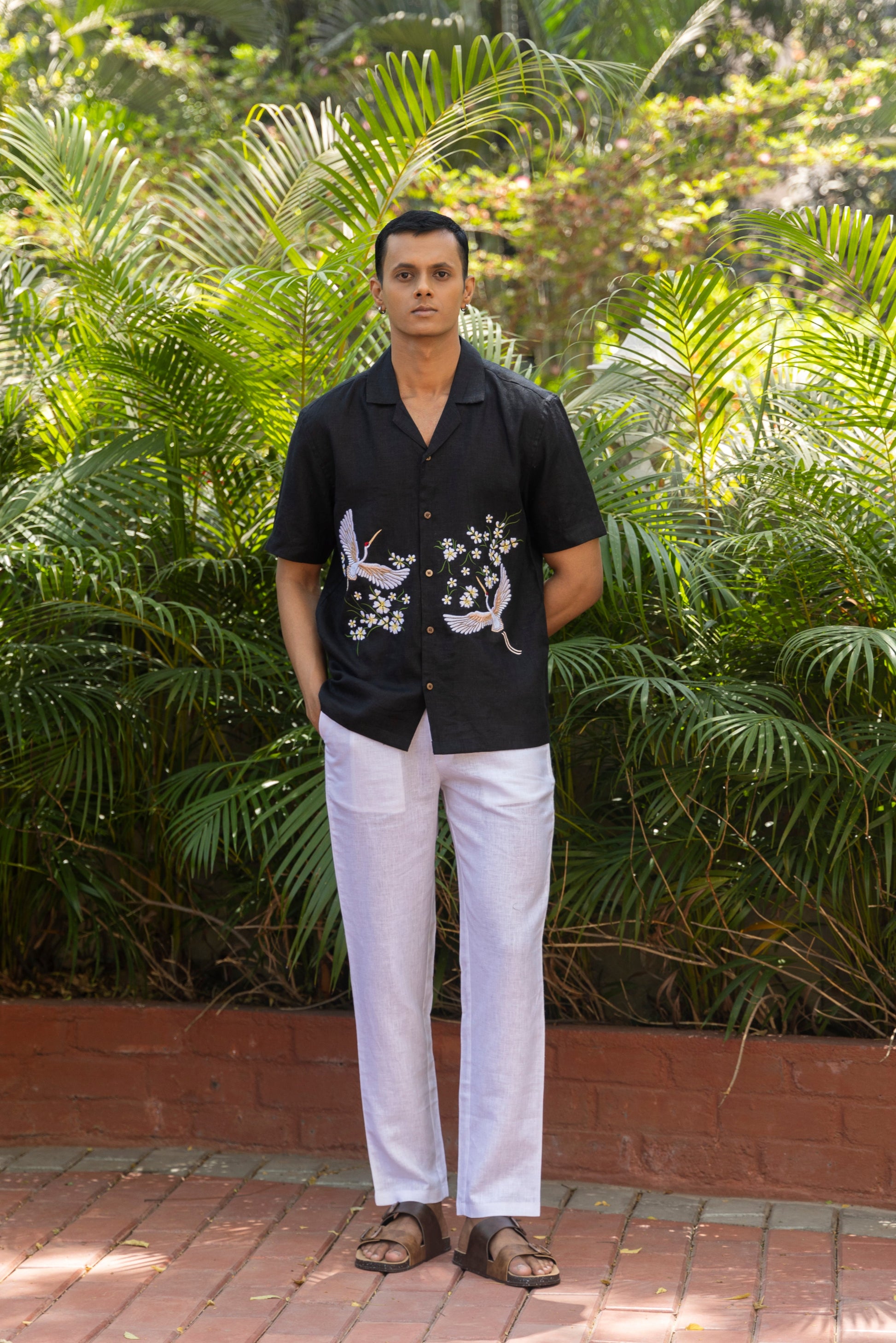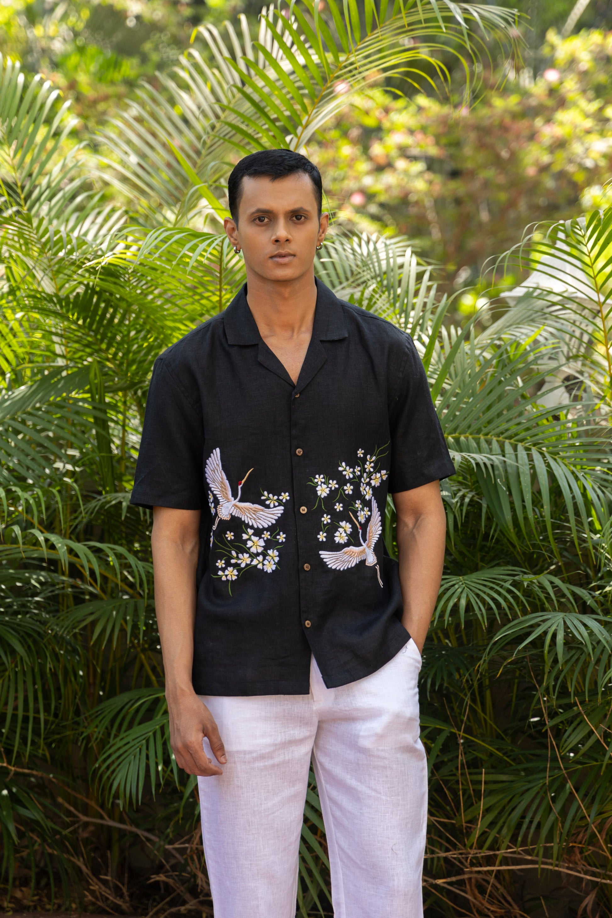 A shirt that speaks the language of the wind! Whispering Wings is crafted from pure linen in a sleek black hue, featuring a relaxed Cuban collar and breathtaking hand embroidery of soaring cranes and delicate flowers. Light, breathable, and effortlessly stylish, this unisex embroidered linen shirt blends elegance with a hint of wanderlust.